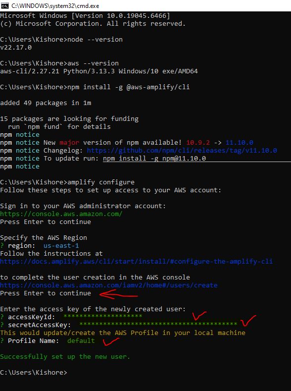 Amplify v5 → v6 Lambda Node 16 → 20 Lambda AWS SDK v2 → v3 Amplify Libraries v5 → v6 React Code v5 → v6 CLI Commandsnode --version aws --version aws configure npm install -g @aws-amplify/cli amplify configure # Create React app npx create-react-app todo-amplify-app cd todo-amplify-app # Install OLD Amplify version (v5) - we'll upgrade later npm install aws-amplify@5.3.12 @aws-amplify/ui-react@5.3.2 # Initialize Amplify project amplify init -- Add Authentication # Add Cognito authentication amplify add auth amplify push # Add REST API with Lambda amplify add api amplify push -- Add DynamoDB Storage # Add DynamoDB table amplify add storage amplify pushsrc/App.css: