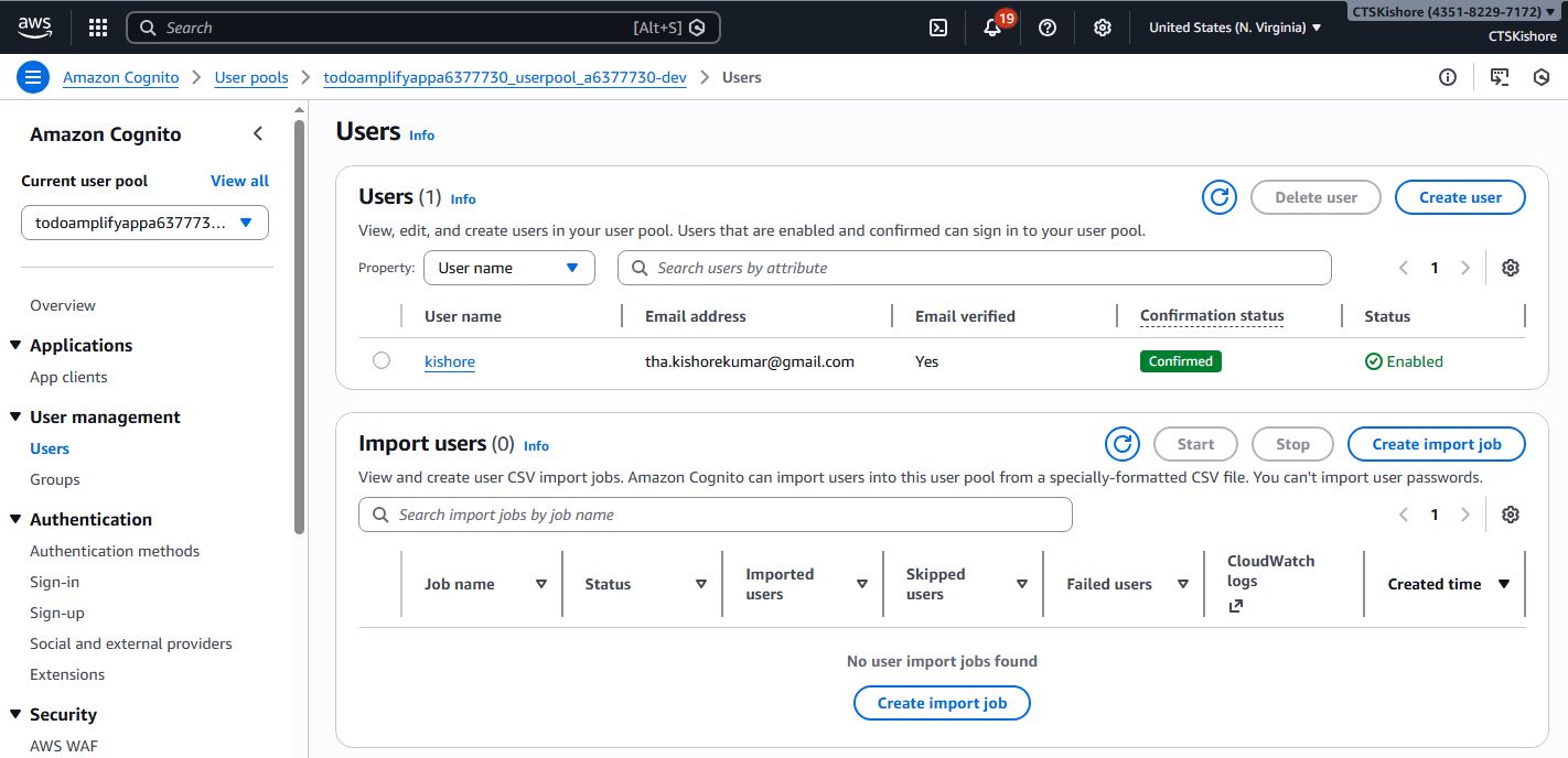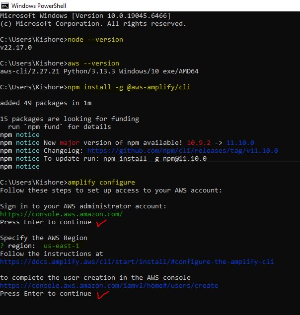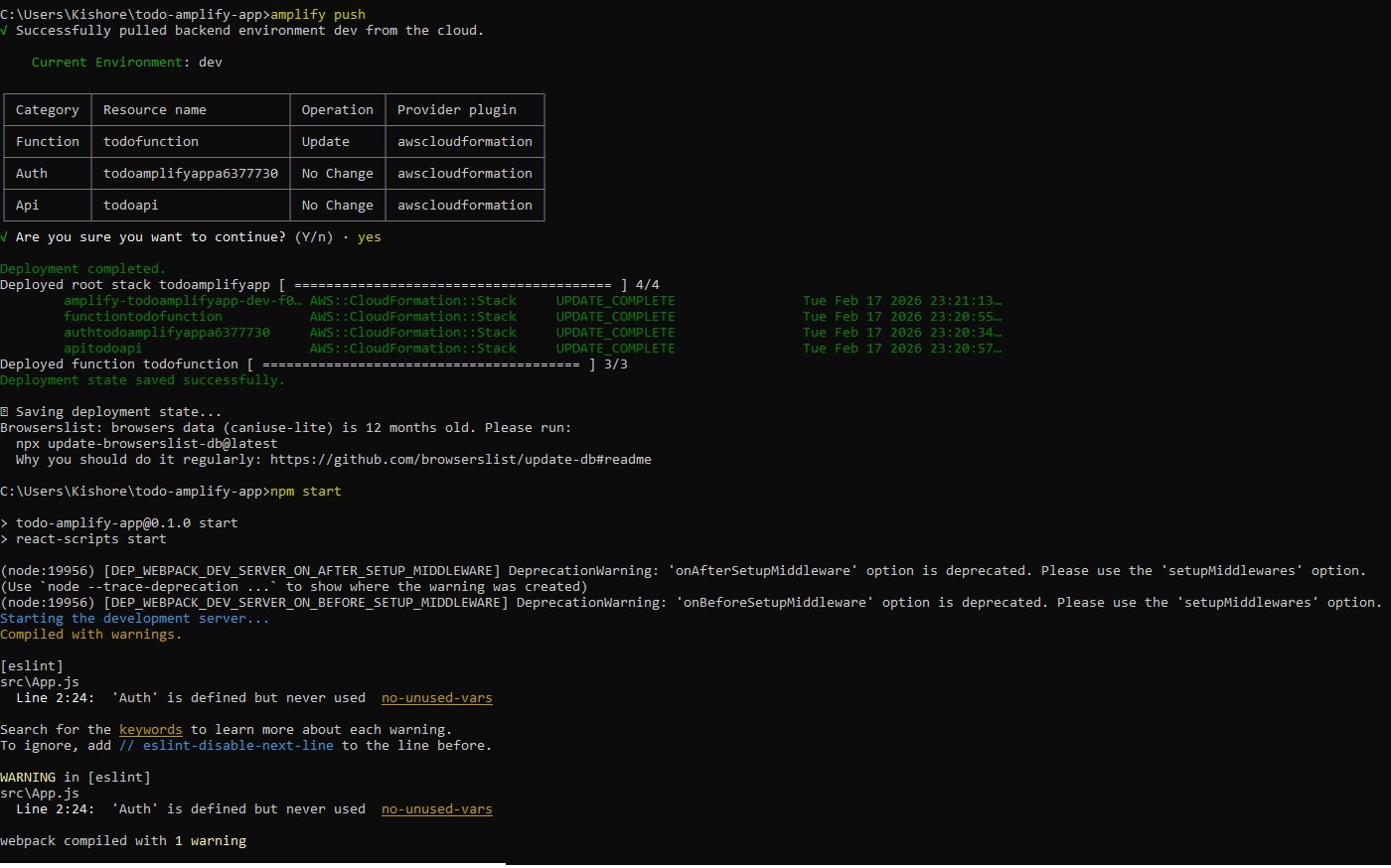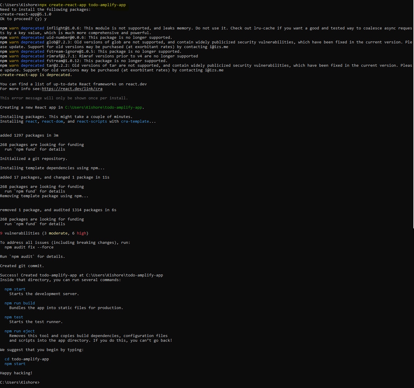 Amplify v5 → v6 Lambda Node 16 → 20 Lambda AWS SDK v2 → v3 Amplify Libraries v5 → v6 React Code v5 → v6 CLI Commandsnode --version aws --version aws configure npm install -g @aws-amplify/cli amplify configure # Create React app npx create-react-app todo-amplify-app cd todo-amplify-app # Install OLD Amplify version (v5) - we'll upgrade later npm install aws-amplify@5.3.12 @aws-amplify/ui-react@5.3.2 # Initialize Amplify project amplify init -- Add Authentication # Add Cognito authentication amplify add auth amplify push # Add REST API with Lambda amplify add api amplify push -- Add DynamoDB Storage # Add DynamoDB table amplify add storage amplify pushsrc/App.css: