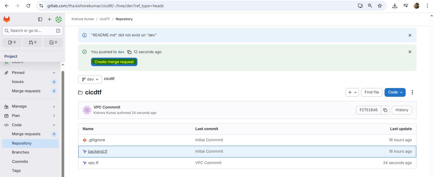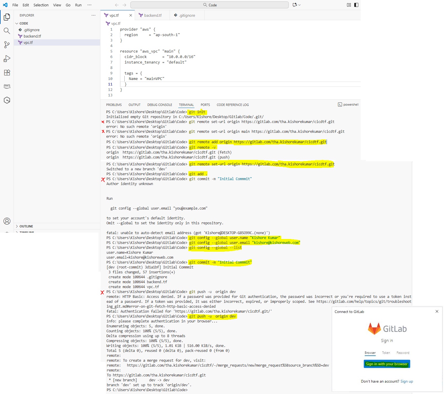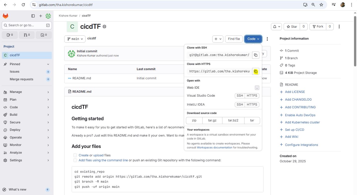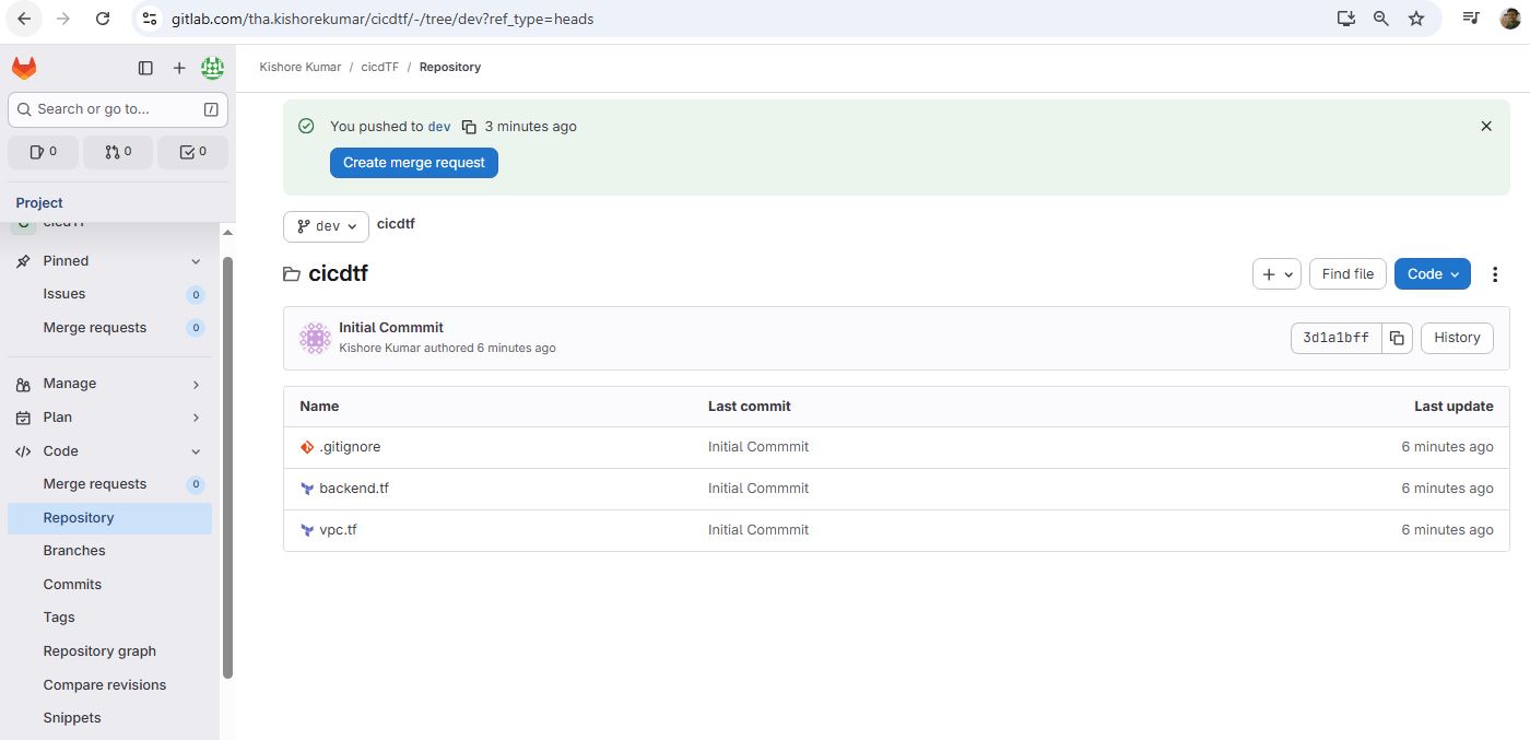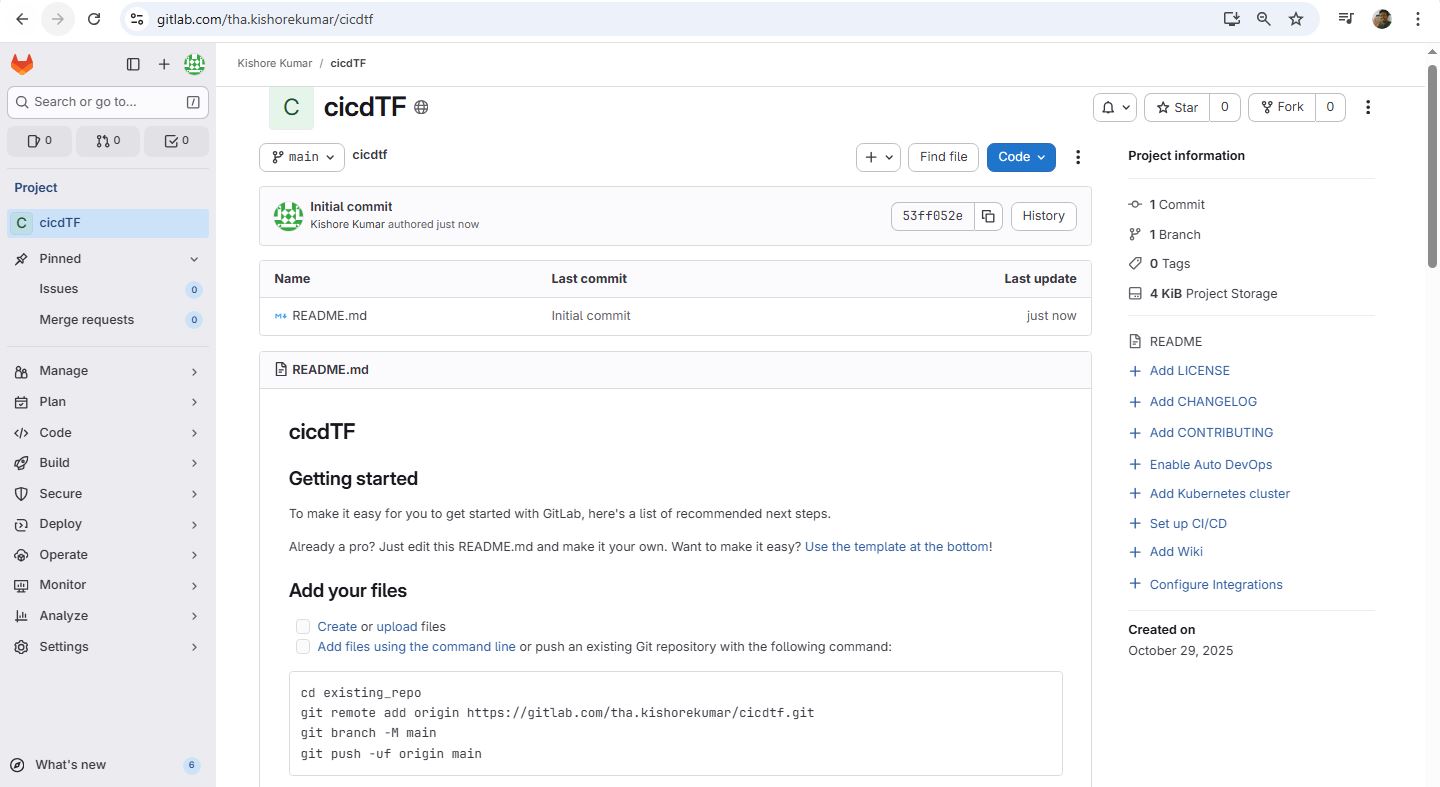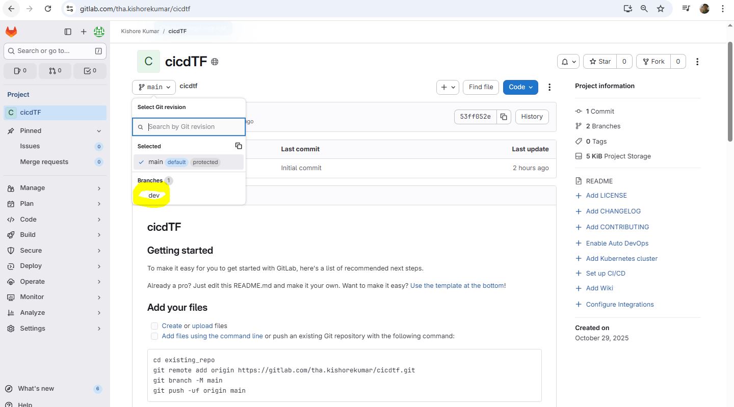 git init git remote add origin https://gitlab.com/tha.kishorekumar/cicdtf.git git remote -v git remote set-url origin https://gitlab.com/tha.kishorekumar/cicdtf.git git add . git config --global user.name "Kishore Kumar" git config --global user.email "kishore@kishoreweb.com" git config --global --list git commit -m "Initial Commmit" git push -u origin dev.gitlab-ci.yml