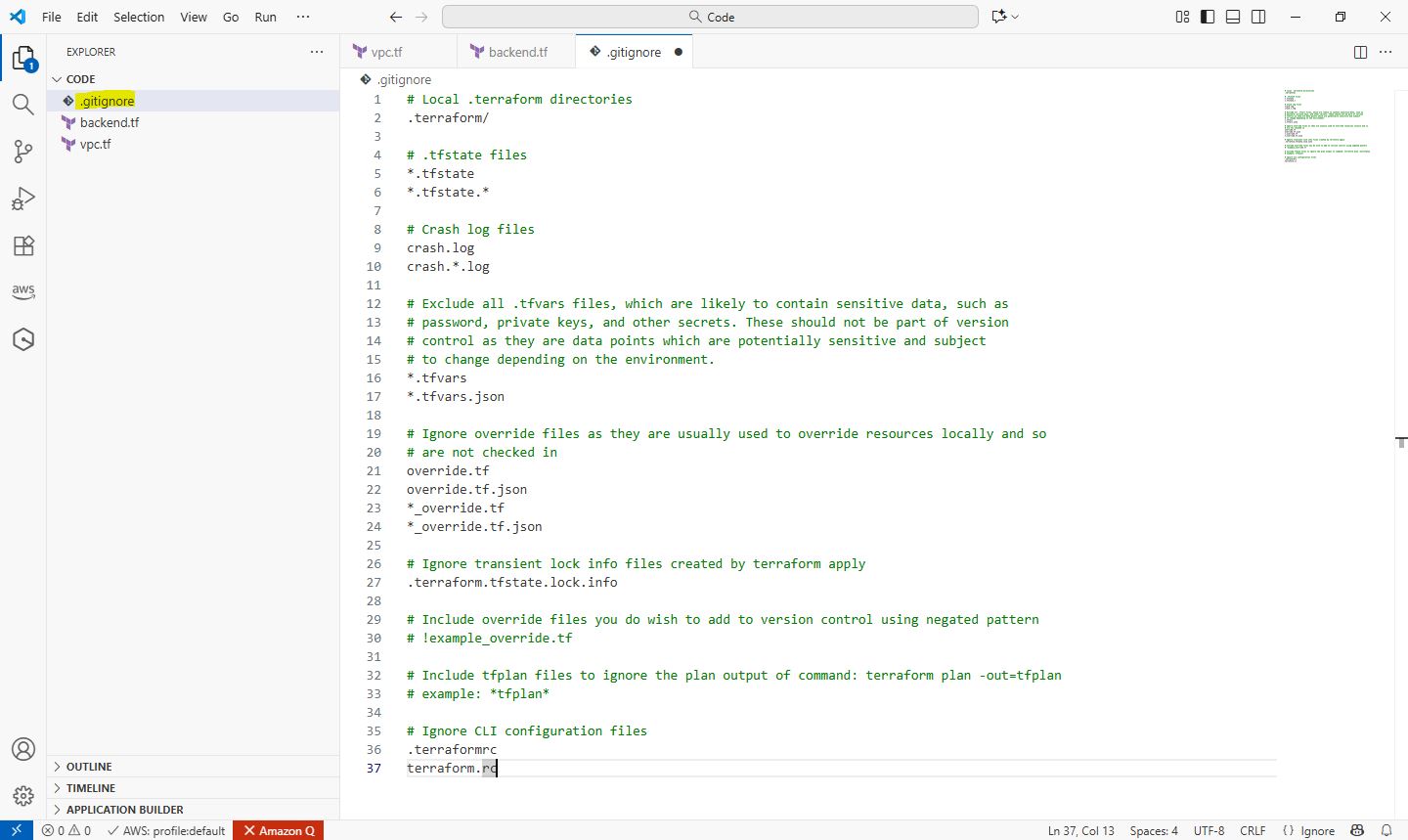 # Local .terraform directories .terraform/ # .tfstate files *.tfstate *.tfstate.* # Crash log files crash.log crash.*.log # Exclude all .tfvars files, which are likely to contain sensitive data, such as # password, private keys, and other secrets. These should not be part of version # control as they are data points which are potentially sensitive and subject # to change depending on the environment. *.tfvars *.tfvars.json # Ignore override files as they are usually used to override resources locally and so # are not checked in override.tf override.tf.json *_override.tf *_override.tf.json # Ignore transient lock info files created by terraform apply .terraform.tfstate.lock.info # Include override files you do wish to add to version control using negated pattern # !example_override.tf # Include tfplan files to ignore the plan output of command: terraform plan -out=tfplan # example: *tfplan* # Ignore CLI configuration files .terraformrc terraform.rc