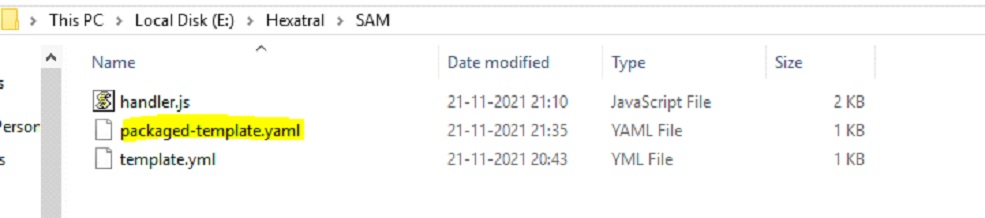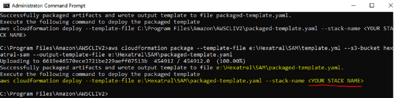 aws cloudformation package --template-file e:\Hexatral\SAM\template.yml --s3-bucket hexatral-sam --output-template-file e:\Hexatral\SAM\packaged-template.yaml